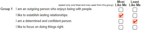You will be presented with 16 Groups of questions. Don't freak out! : ) Each group consists of four statements and you must only choose ONE that is MOST like you and ONE that is LEAST like you.